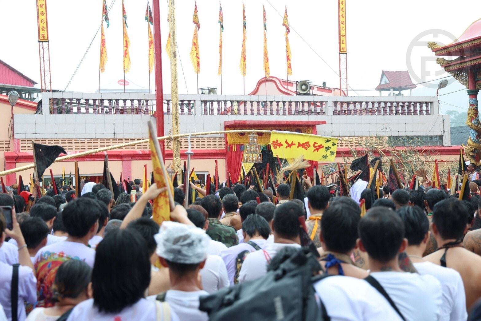 À 4h45, les sanctuaires de Phuket ont organisé des cérémonies synchronisées pour ériger le mât Go Teng, une imposante structure en bambou symbolisant l'invitation des Neuf Dieux Empereurs à descendre présider les festivités. Les lanternes, symbole de la présence et de la protection divines, ont été hissées au sommet du mât devant une foule nombreuse de fidèles et de touristes, dont beaucoup étaient vêtus de vêtements blancs traditionnels, symbole de pureté.