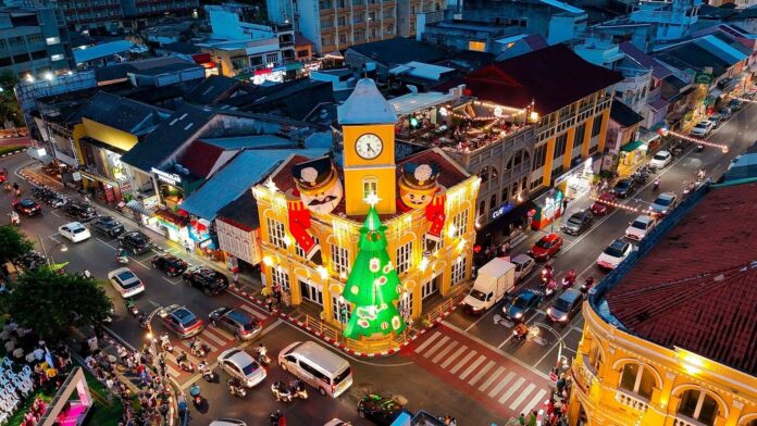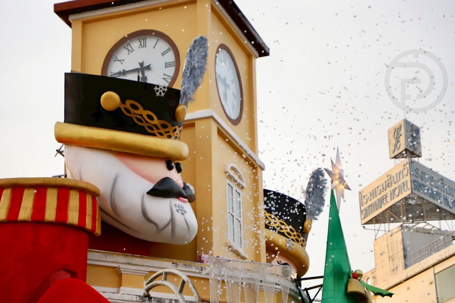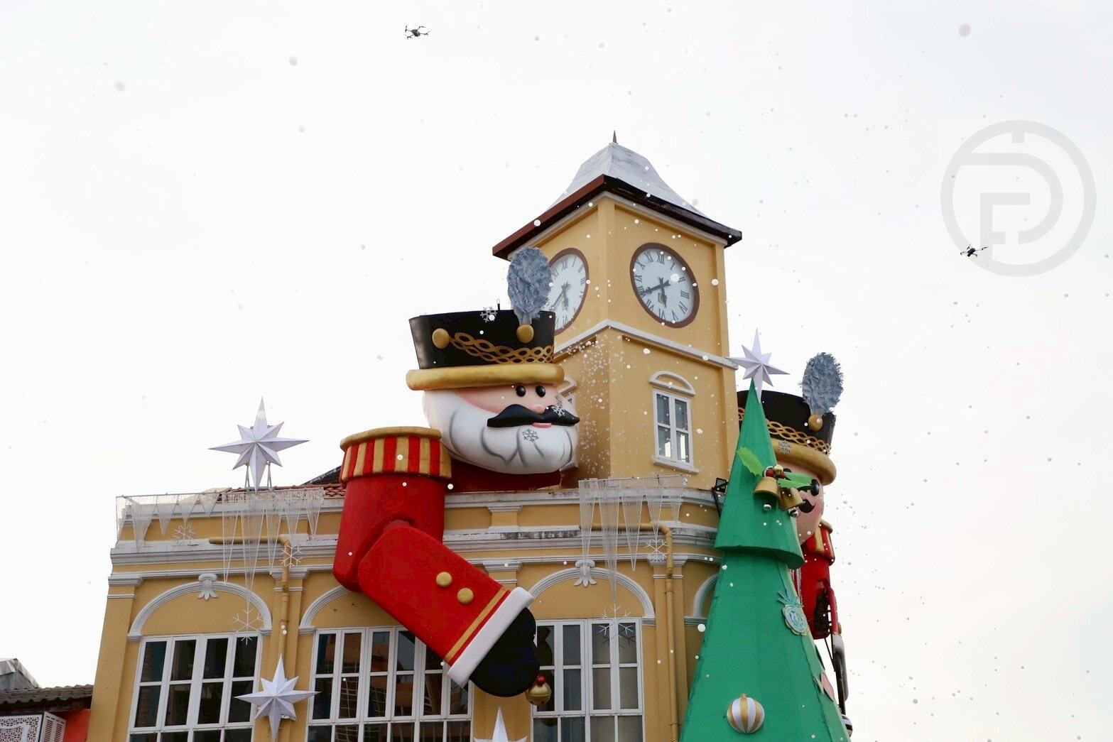 Trois monuments emblématiques — le carrefour de la Chartered Bank, la tour de l'horloge de Surin et la fontaine Suriyadech — ont été décorés sur le thème de Noël et du Casse-Noisette, créant une ambiance festive et animée dans la vieille ville et ses environs.